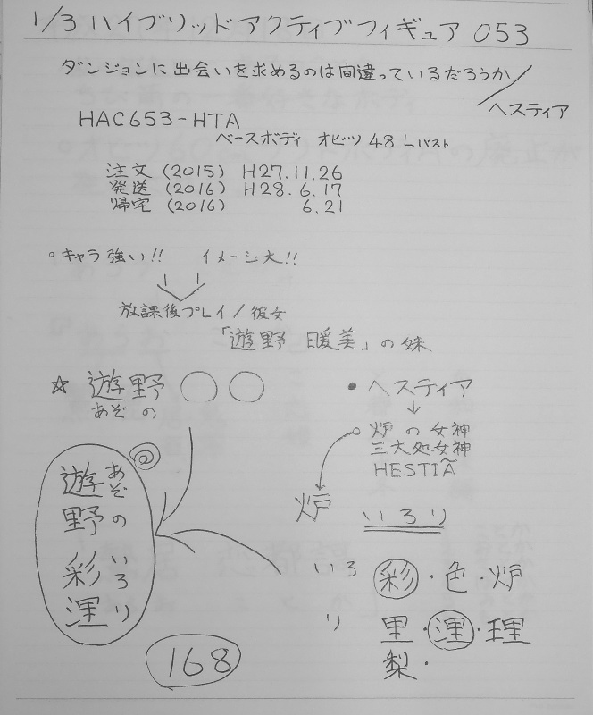 今回帰宅したのは、正式名称なが~~~いのよね! 『1/3 ハイブリッドアクティブフィギュア053 ダンジョンに出会いを求めるのは間違っているだろうか/ヘスティア HAC653-HTA』の~~~帰宅です 注文は平成27年11月26日 遅延は平成28年05月発送予定が1か月遅延 発送は平成28年06月17日 帰宅は平成28年06月21日です。 女神様なんで、遠阪家でも女神として扱うと思ったら大間違い(爆) あくまでもちび萌奥さんズとして愛情もって実践し愛でて行きますよ んでんで、当初は榛舮部四姉妹の最後を飾る峰祐子たんにしようと 決定していたんですが、そこはほれ・・・イメージが強すぎて~ アニメもなんだか面白くて見入ってしまい全13話楽しませてもらっちゃったんで、 その娘のイメージが定着しちゃったんですよね(苦笑) んなもんで、同じような経緯でちび萌リトル奥さんズになった 『放課後プレイ/彼女』の例がありますんで、 急遽夢幻的散文第66章の続編として遊野暖美ちゃんの妹と決定しました で!苗字はアゾンっ娘なので遊野で問題なし(`◇´*)ゞ 名前は~~~ 下の画像の様に考えまして、ヘスティアの意味を残して日本的な名前を命名しました ![]() では、紹介をちかちゃんにまかせますちかちゃんよろしく~~~ っつ~~~~~~~事で、 はいはいはいヾ(●⌒∇⌒●)ノ ![]() 遊野彩浬ちゃんの紹介です![]() ![]() 衣装は魅力的な例の衣装ですね我が家では、原作に引っ張られるのを嫌いますが、 (じゃぁ、買わなければいいだろ?) この作品はキャラがとっても魅力的 (可愛いから帰宅させるんですよ☆) なので、ある程度原作を引っ張る事にしました 結果、こんな感じです ![]() 例の青リボンは見えない様に(うふふ)旦那だけの特権? 魂籠めちゅ~ちゅ~儀式をよろしく~~~ は~~~~~い神様♪ヘスティア様♪よろしく~~~ ε=ε=ε=ε=ヽ( ̄3 ̄)ノ ちょっと待った! ε=ε=ε=ε=ヽ( ̄3 ̄)ノC≡(・。・C≡)≡≡≡![]() ゚・゚.゚・゚.゚・゚.*・(゚ε゚(☆○=(`◇´*)o![]() 違うでしょ!遊野彩浬ちゃんでしょ!!! そでした・・・ それでは、あらためて魂籠めちゅ~ちゅ~儀式をお願いします はい(`◇´*)ゞ 君は遊野彩浬ちゃんですよ~~~( ̄3 ̄)むっちゅううううう っつ~~~~~~~事で、 ![]() 暖美ちゃんところは、二人姉妹なのね そうでもないのよね(苦笑) え? こ・これは、まだまだ増える伏線か!!!![]() ![]() 自分で言わないの!! ![]() ![]() 会話用 ![]() 系譜用 ![]() 紹介用 ![]() で?誕生日は??? 帰宅日の06月21日っつ~~~~~~~事で 06月21日帰ってまいりました遊野彩浬です(平成28年07月27日) |