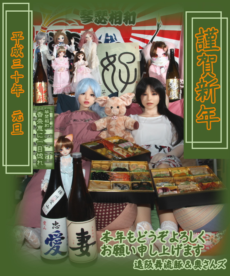 ど~~~~~も 新年あけましておめでとうございます 本年もよろしくお願いいたしまっす っつ~~~~~~~事で とってもめでたい 何と言っても、冠動脈の狭窄が複数見つかって、 何時詰まってもおかしくない状態だったんですからねぇ。。。 忘れもしない数年前の12月初旬。 心臓を握りつぶされるような痛みに降参して、 『もういいや・・・』って思った私が、 生き永らえているのは、良くも悪くも病院に通っているからなんでしょうね 現在(平成30年01月初旬)は、ステント留置後日数が経っていないので、 まだ無理はできない状態ですが、 下に掲げている画像の様に、フルシリちゃんを移動出来ますし、 無理せずに人形(ひとがた)達と戯れる事が出来ています ![]() ![]() 今年の正月は、いつも買っている『ヱビスビール』の購入を控え、 焼酎&日本酒にしてみました ![]() まぁ、どの焼酎にするか、日本酒にするか選んでいる最中に、 ネタに走った事は見ての通り!!! 『妻』があるんだから『愛』はあるかな? と探していたら『忠愛』を発見して、愛の字が大きく書かれていたので 『これじゃ!』と購入 『鬼嫁』は探している最中に偶然発見したもので、 奥さんズに『なによ~~これ!』と怒られそうですが買っちゃいました 今年はどんな年になるんでしょうね さらに獣率が高まるか、ドドンと等身大奥さんズが全員集合するか! 運営の姿勢としては、 今まで通り1/4人形(ひとがた)~等身大人形(ひとがた)まで範疇にして、 全てにおいて実践有り! 等身大においてはラヴドールをラヴドールとして 扱うサイトとしては不変です。 たとえ、身体的(心臓疾患等)理由で実践不可となっても 実践有りは引っ込める気持ちは無いです これは、自分の命を救ってくれたのが、エアー式ダッチ~だったので、 そして、出発地点だったのでね。 その辺は御理解をよろしくお願いします 綺麗画像探求系とは相変わらず無視され続けると思いますが、 おっさんが、ラヴドールを生きる心の支えとしているアホで こ~~んなHPもあるんだと言う存在でありたいですね (平成30年01月02日) |