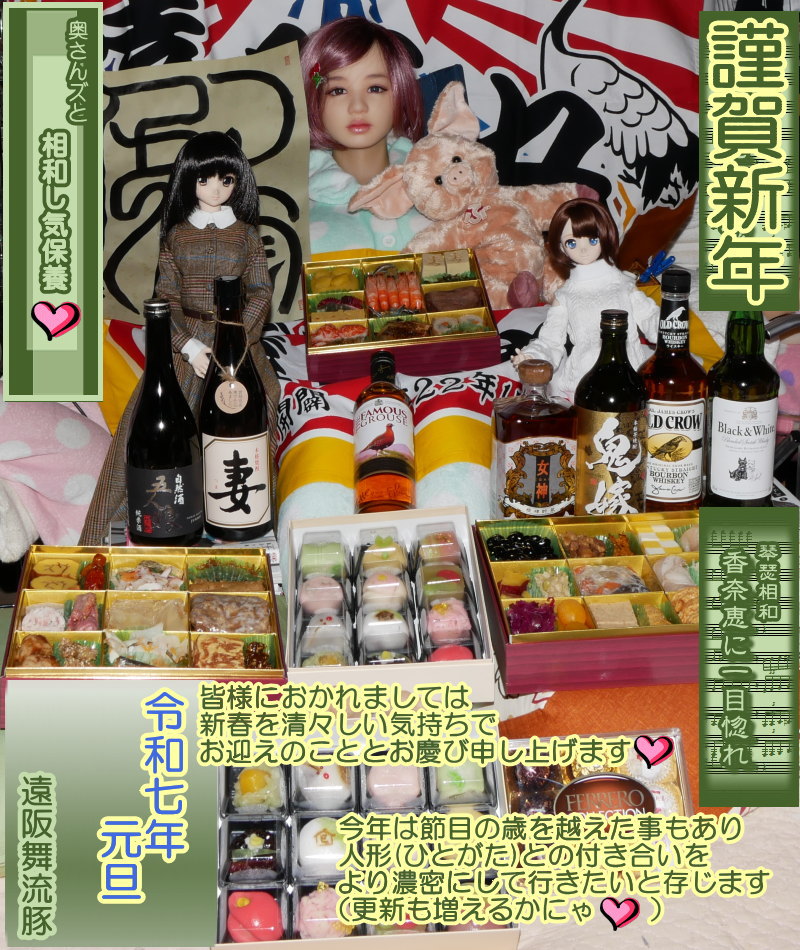 新年あけましておめでとうございます。 遠阪舞流豚、還暦を迎えまして、更にいっそう人形(ひとがた)との付き合いを 濃密にする所存でございます っつ~~~~~~~~事で 昨年は細々更新で『生きてるの?』『ついに死んだか・・・』状態 交流は以前からお付き合いのあった方々のみでしたね 『廃ドーラー』呼びされて以来 こちらからは声をかける事が出来なくなりましたからね まぁ~新規に訪れる事のない過疎サイトになってしまいました 身体の方はゆっくりと悪化傾向です 循環器系の疾患なので、無理を出来ない状態 そんでもって無理しないから筋力が油断していると落ちちゃう・・・ だんだんと体力も落ちて来て、なんとか月一回の栄養士相談で 少しずつ筋力をアップしている最中です まだまだ等身大奥さんズをお姫様抱っこ出来ますし、 これ以上体力落としたくないですね 幸い発作の方も小さなものしか起こらずに推移しています 検査入院も免れました 今年は人形(ひとがた)との付き合いを 更に濃密にしたいと思っています 今まで以上に濃密って・・・ どんな感じになるのかわかりませんがね 更新は増えるのかなぁ ではではそんな感じで、今年もよろしくお願いします ![]() ![]() なんだか、31日の夜からはじめて、徹夜で6時位に更新しましたが、 あっと言う間に時間が過ぎてました まずは配置を考えながら『おちゃけ』を置いて行き ![]() 後は一気に配置~撮影です お節は、いつもの博多の業者から ![]() ![]() ![]() 和菓子もいつもの近江の手作り和菓子 ![]() お酒は好きなもの全員集合 ![]() 千葉の純米酒『五人娘』 焼酎『妻』 ![]() 焼酎『女神』 一番好きな焼酎『鬼嫁(芋)』 バーボン『オールドクロウ』 スコッチ『ブラック&ホワイト』 ![]() そしてスコッチ『フェイマスグラウス』 さぁ~~~~飲むぞ (令和07年01月01日) |