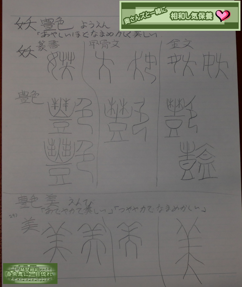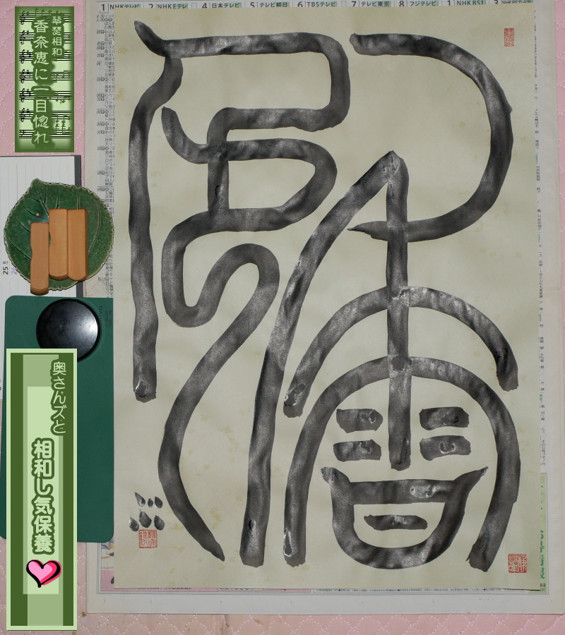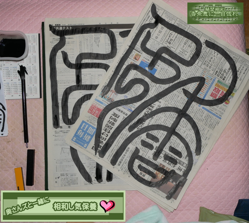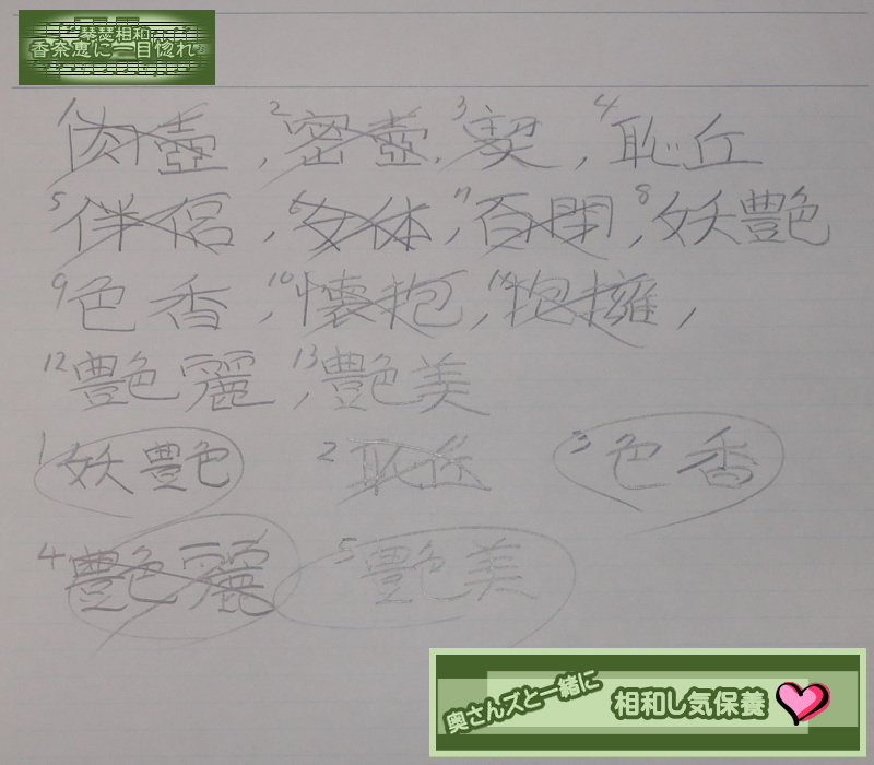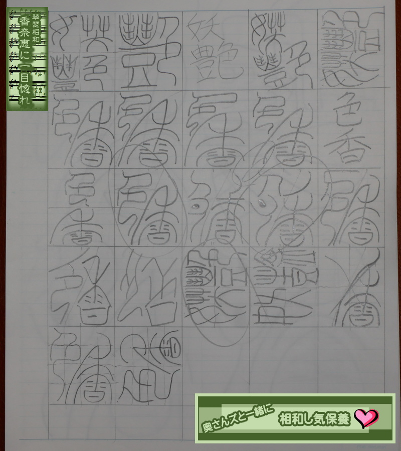 っつ~~~~~~~事で 今までの書初めのおさらいを 平成26年は『愛撫』 ![]() 平成28年は『甘噛』 ![]() 平成29年は『時雨茶臼』 ![]() 平成30年は『好』 ![]() 平成31年は『口吸』 ![]() 令和2年は『陰阜』 ![]() 令和3年は体調不良で残念ながら書初めは無しでしたねぇ。。。 令和4年は『姫始』 ![]() 令和5年は『若布酒』 ![]() 令和6年は『美乳』 ![]() 『愛撫』『前戯』『甘噛』『時雨茶臼』『好』『口吸』『陰阜』『姫始』『若布酒』『美乳』 ま・まぁ。。。ぶれない事は良い事だねぇ… エロ書道限定ではないけどね え?そうなの? 他にも『幽愁』とかね![]() あっ まぁ、9対1でエロ方面だけどね んで?今年は何になったのかな? まずは昨年11月20日に『第1回令和七年書初めお題選定委員会』が開催 13候補が上がりました ![]() 『肉壺』『蜜壺』『契』『恥丘』『伴侶』『女体』『百閉』『妖艶』『色香』『懐抱』 『抱擁』『艶麗』『艶美』の13候補です その中から5候補まで絞りました『妖艶』『恥丘』『色香』『艶麗』『艶美』です 『第二回令和七年書初めお題選定委員会』が12月01日に開催 それまでに3候補まで絞って、篆書・金文・甲骨文の 字姿を見つつ選定しました ![]() ![]() んでぇデザインを考えつつお手本書きをしてみました ![]() お手本書きは下の画像![]() 縦書きの『色香』横書きの『妖艶』ねっ 『色香』は縦書きっつ~~~~か・・・まぁ、ギリ縦書きですね 『女へん』は『好』とか『姫始』で書いたから 『色香』にしようかな~~~って考えていると 『妖艶』のゴチャゴチャ感も面白そうだし って考えてなかなか決まりませんでした そんでもってぇ『第三回令和七年書初めお題選定委員会』が 12月04日に開催されました 候補が絞れて『お題』が決まったのね はい~~~~~ お題は『妖艶』です これから全懐紙横使用で横軸4分割縦軸8分割にして お題のデザインとかを細部まで決めて行きます 筆はどうするかな~~~ 細いか太いか ここからは時間とやる気の勝負ね 楽しみが大きいから大丈夫と思います ところがどっこい 『第4回令和七年書初めお題選定委員会』が12月28日に急遽開催されて 『色香』の方が書いていて楽しいから 『色香』にしたいとの の申し出により変更になりました 急遽開催してもらってありがとう『色香』の香の文字が書いていて楽しかったんで 無理を言って申し訳なかったです 下の画像の様なデザインで『行こう!』となりました![]() 次は筆ペンで大体の見本を書いてみてそれを見ながら新聞紙に練習です ![]() ![]() 新聞紙で練習したあと、全懐紙で清書を ![]() 清書直後のまだ墨が乾いていない状態 なかなか面白く書けた思いがします 乾いたら、落款印・関防印・遊印を押して ![]() 例によって落款印は『舞流豚』 ![]() 拡大すると印がズレちゃってますねぇ。。。 気を取り直して 今年の書初め『色香』でした ![]() ![]() (令和7年01月01日) |